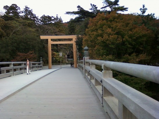 20日。南海和歌山市駅11時29分発の特急サザンでなんばまで。徒歩7分、近鉄難波まで。近鉄上本町で乗り換え、13時15分発五十鈴川行き急行で15時27分伊勢市駅着。駅前からバス。内宮前着16時8分。色づいた木々を左右に見ながら宇治橋を渡る。橋の内宮側の鳥居が新しくなっていた。