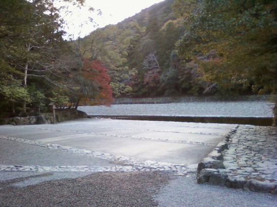 幽(かす)かに五十鈴川の水音。御手洗場(みたらし)の石段を川のすぐそばまで下りると、紅葉が夕陽に映えて水面もキラキラと耀く。二匹の大きな真鯉の姿を追っていたが、よく見ると足もとに数十匹の稚魚。