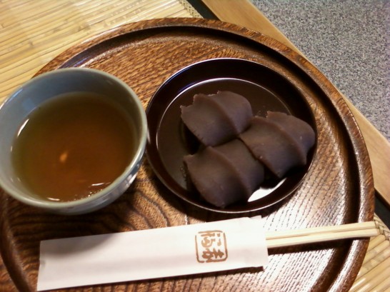 夕食前だったが、甘党が食べずにいられない赤福餅。外宮前特設店でいただく。3個290円。お茶がまた美味しい。