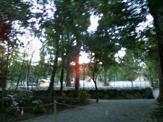 参拝を終えてから、帰りの北御門口参道(きたみかどくちさんどう)から東御敷地(ひがしのみしきち)越しに拝したご正宮(ごしょうぐう)。赤い夕日の右下が豊受大御神(とようけのおおみかみ)をおまつりするご正殿(ごしょうでん)
