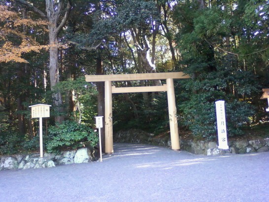 徒歩でおはらい町を少し散策。大宮司職舎、五十鈴塾、祭主職舎などの横を通って、再び御幸道路へ。上は五十鈴川駅に向かう途中の月読宮参道入口の鳥居。