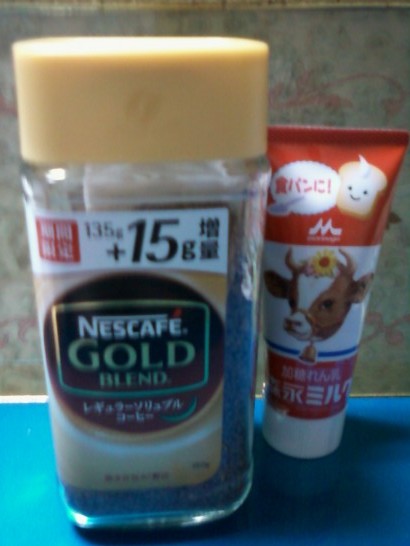 デスクワークはだいたい午前3時頃まで。ごく静かな時間帯なので、集中できるという良さがある。休憩にはコーヒー(最近は芋焼酎のうす~いお湯割りも)。凝って木製のコーヒーミルで豆から挽いて淹れていたこともあったが、最近はもっぱらインスタント。いろいろと試したが、結構美味しく飲めるのが下の組み合わせ(見たら分かるけれど、一応商品名は伏せます)。