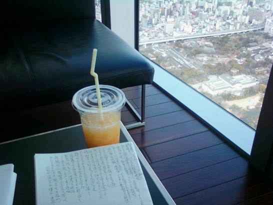 エスカレーターで59階、58階と降りて、スカイガーデン300にてオレンジジュース(400円)を購入(9時40分)、北向きのソファ席で下界を見下ろしながらの優雅な作句。客はまだちらほらとしかないので、超高層階を楽しみながら1時間余り句を練る。