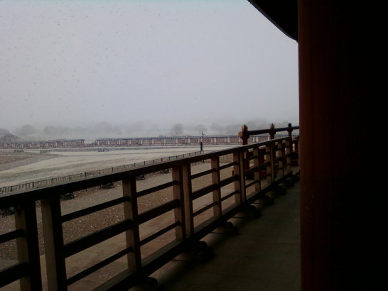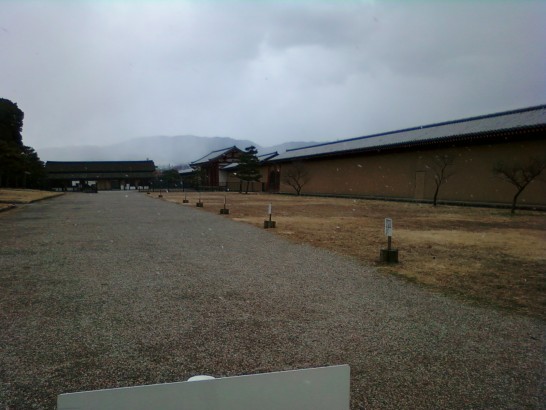 吹雪が緩くなると、朱雀門の影が先に見える。