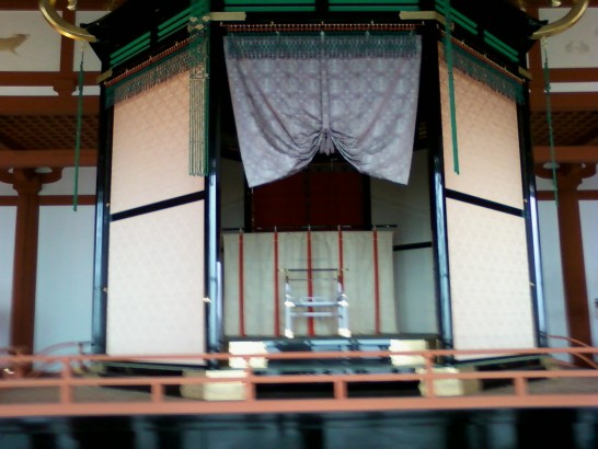 再び吹雪の中へ。第一次大極殿のすぐ東へ。入口を探して歩く。北側から階段を上って中へ。帰りのバスの時刻が気になるので、守衛さんに伺うと15時52分とか。半時間ほどあるので、ゆっくり内部をケータイでパチリ。