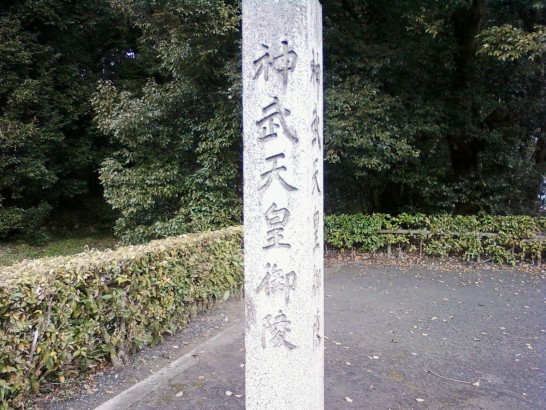 参道の入口。碑の「神武天皇御陵」の「武」の字の特徴。