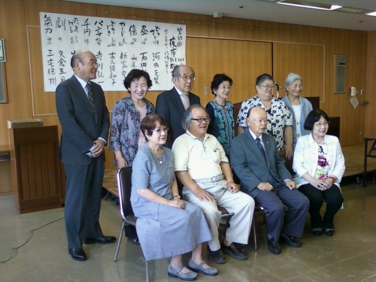 南海和歌山市駅8時11分発のなんば行き急行で天下茶屋、高野線で堺東まで。車中推敲。コンビニでパンと紅茶花伝(ミルクティー)を買って堺総合福祉会館5Fまで。まだ準備中の句会場に入らせていただいて、推敲。五月、月子、敏治、碧、智三、准一、保州、日出男、天笑、朝子、堅坊ほかみなさまとご挨拶。(写真:第33年度夜市川柳ベストテンに入られたみなさまの記念撮影)