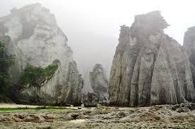 海岸沿いに2キロメートル以上に亘(わた)り、奇異な形態の断崖・巨岩が連なる。緑色凝灰岩を主とした岩石が、長い間海蝕を受けた結果形成されたものらしい。それぞれの奇勝に浄土のイメージを重ねて「如来の首」「五百羅漢」「極楽浜」などの名が与えられている。陸上から近付くのが困難な土地で、長く地元民のみに知られる奇勝だったらしい。