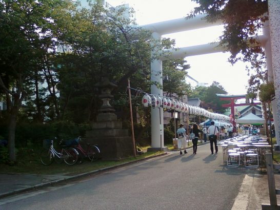 境内をあちこち眺めながら、ここが棟方志功の幼年期を過ごしたところかと、感慨。どこにでもあるような神社だが、歴史はかなり古い。丁度祭りの準備中。境内を抜けてふり返る(写真)。新町通りへ。果物(小メロン(108円!)と桃(3個108円!)。桃、これが食べると口中がしびれるクワセモノだったのね。メロンもちょっと…。農薬なんでしょうか? 安いし、文句は言わずホテルのクズ籠に捨ててきました)と牛乳をゲット。ホテル(アートホテル カラー 青森)まで。(本日の食費、ペットボトルのお茶・水代含め約1560円)