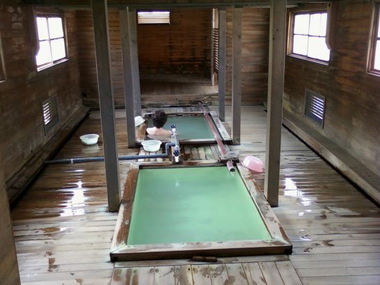 洗い桶に湯を掬い、水で割って身体を流すと、なんと一、二度で、石鹸も使っていないのにサラリと汗が取れる。かけ流しの高温の温泉だが、湯ぶねにどんどん水を足して適温にすることができた。「…」。あちこちの温泉に行ったが、これほどの湯はそうない。ヒノキの湯小屋は清潔、至福の時間だった。まさかこんなところでこんな温泉に出合えるとは!