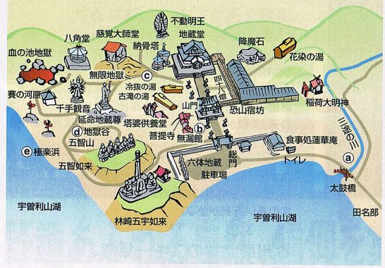 左手に抜けて、無間地獄の方へ歩いてゆく。血の池地獄から賽の河原…。あっという間に湿らせていた下着も服も乾く。暑さであまり人が歩いていないので、極楽浜に出たあとはより注意(倒れたりしないように)、一歩ずつ足元を確かめながら歩く。硫黄臭。暑さもあって、気分が悪くなる。