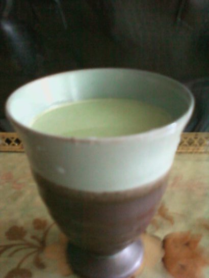 お抹茶に砂糖を加えてもいいけれど、いちおう世の中には便利な品があるので(無精者の言い訳)。写真のように、大きめのカップの湯に粉をたっぷり入れて濃厚な抹茶(+砂糖)液をつくる。適当なカップに少し移し替え、冷たい牛乳と氷で好みの甘さになるように割ります(な~んだ)。