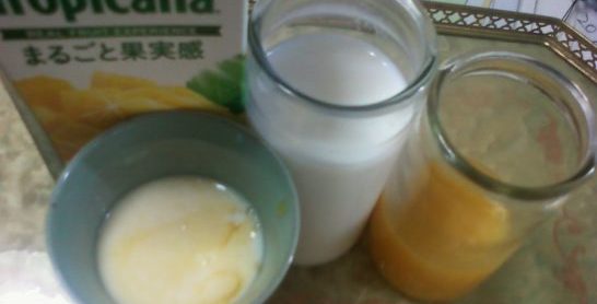 次も美味~。りんごとマンゴーのミックスジュース(うしろに隠れています)。これと牛乳を好みの比率で混ぜて撹拌。
