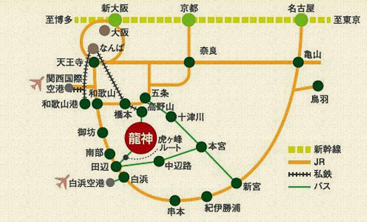 とにかく吟行は観光とはちがうのである。(優雅にしてしまうと、かえって一句もできないのね) 万一の危険を避けるためにも、いつも通り古着をまとってひたすら詠んでくることに。温泉?、もちろんたっぷり浸かってまいります。お肌ツルツルしっとりの〈日本三美人の湯〉ですもん。下は龍神温泉へのアクセスマップ。