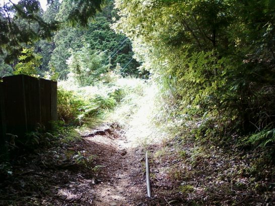 先を見ると、いかにもクマが出そうな山道(写真)。しばらく思案、やはりやめておくことに(迷惑をかけるようなことになったらマズイもんね)。