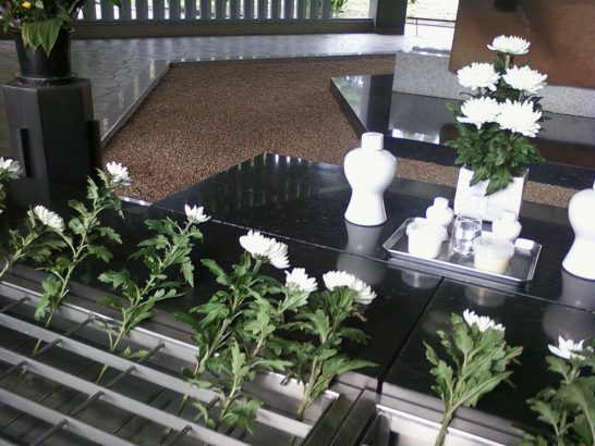 雨の中、神保町のホステルを出たのは8時頃だったか。珈琲館で朝食、吟行のための資料に目を通す。九段坂を上り、鬱蒼とした木々の下を千鳥ヶ淵に沿って墓苑まで。参拝、白菊を手向ける(写真、中央があきこの手向けた一輪)。