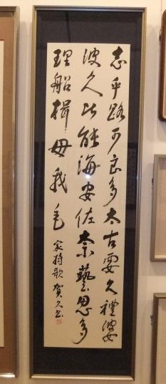 ほの暗い空間で、ゆったり書を鑑賞すれば心も落ち着く。よいと思う作品にだけじっくり向き合う。読めなくとも空間構成のバランス、墨色。さながら音のない音楽会のように、何かを語りかけてきてくれる。