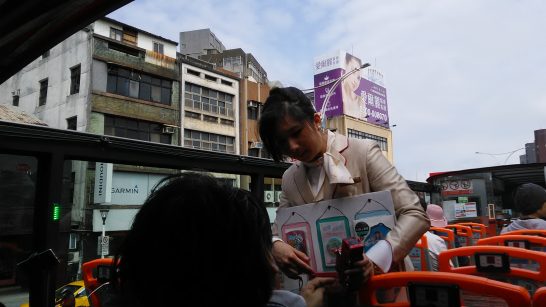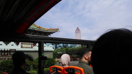 オープントップバス4時間乗り放題をネットで予約、電子チケットを印刷して持ってきていたのね。台北駅M4出口前から出発。まず台北市内を青ルート、赤ルートと一巡することに。(写真右:總統府)