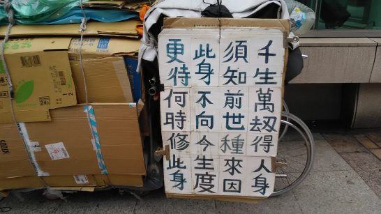 自転車に生活用品やたくさんのダンボール箱などを乗っけて駅近くに止めていたのね。何と書いてあるのか、意味はよく分かりませんが。心ひかれたので、パチリ。(分かる方、教えてください)