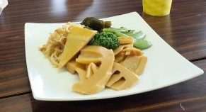 真島ご一家手作りのタケノコなどの煮物を弁当に添えて各テーブルに出していただく。たいへん美味。(^q^) おもてなし、ありがとうございました!!