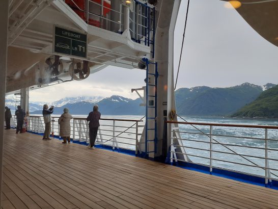 7階デッキは運動不足をおぎなうためのウオーキングに適した場所だが、もちろん屋根付きで景観を楽しめる場所でもある。写真は、シトカ(米国)からスワード(米国)へ走る🚢からの景色。