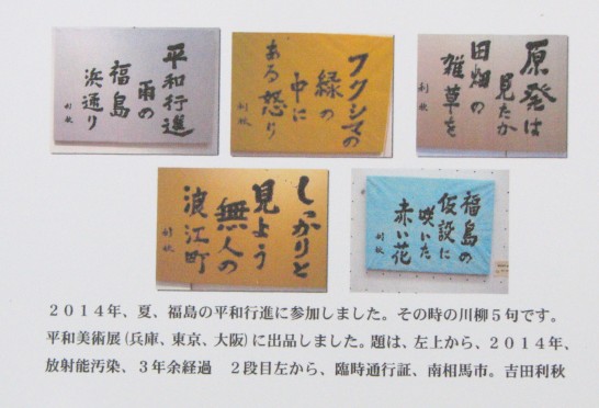 ▼妻が亡くなっても、川柳大会など積極的に参加するなど、生き生きとやっている▼昨年九月に後期高齢者になったのを機会に、自分史を書いている。月二回、二ページのペースで書き、子や孫に送っている。二年目に入り、あとどれだけ書けるだろうか▼住んでいる団地の土砂災害が、サンテレビで取り上げられた。自治会でも避難対策を考えているが、六十五歳以上が四十五パーセントを占め、独り暮らし、デイサービス利用者、車いす生活者の避難誘導など問題が山積している▼全国川柳作家年鑑の校正のお手伝いを初めてした。すごく大変▼子供のいない叔母の介護をしてる。急性痴呆で徘徊が激しく二度警察で保護された。保護された時のため、身元と連絡先が分かるようにしておくことが必要▼二回目の出席だが、楽しい▼次男から「金持ち父さん貧乏父さん」の本を贈られた。私と次男と孫の世代における感覚がどう変化しているのかを知りたいらしい▼「よっこらしょ」が口癖になった昨今、フィットネス「カーブス」で、三か月筋トレに励んだ。お腹周りが一センチ引っ込んだ▼体重管理のため、約一年間朝晩二回体重を計りグラフにしている。気の弱い人には効果は大▼神戸市の男女共同参画川柳で最優秀に選ばれた。「かっこいい仕事も家事もできるパパ」これで残りの人生の運をすべて使い果たしたのでは▼いなみ野学園神戸西地区のボランティアで神戸自然教育園にいき、案山子つくり、芋、大豆畑の草刈り、農器具庫の清掃などした。二日後から筋肉痛!▼駐車していた四トントラックが、バックする時「バックします 気~つけてや」と言い出し驚いた▼今日句会にくるとき駅で四十年ぶりに友人に出会った。娘さんの名前がすぐ出てきて、まだ呆けてないと安心した▼三年前まで母親が住んでいた築百六十年の家を兄弟が集まって取り壊し更地にした。一つの時代が終わった。好きな物を持って帰れと言われ、古い裁判記録と母親の遺影をもち帰り、妻の遺影の横に飾っている▼九月に念願の敬老パスをもらった。パスの効果か、敬老の日に子供たちが集まり古希の祝いをしてくれた。