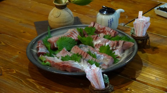 今日の御馳走、ハマチのお造り。本日の銘酒は