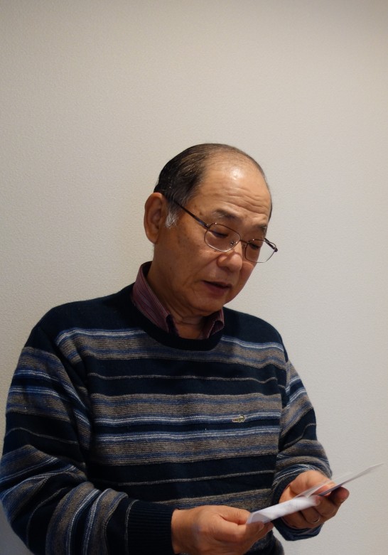 ▼選挙の立ち合いで疲れた。各種検査の結果はよかった。あと十年は行けそうだ▼先月は七五三、今月はクリスマスパーティーと孫にお付き合いしている▼川柳に嵌っている。多数の句会に出席し、充実した毎日を送っている▼数年前から年賀状を二十枚に減らしている。この内喪中が三人もいた。こんな歳になったんだと感慨深い▼久し振りに東京に行ってきた▼今年は喪中ハガキが多い。癌治療の方針が変わり、川柳が作れない▼念願の対面キッチンなどの家のリフォームが終わり、反動で盛り上がりのない一か月だった▼年末の恒例の仕事が回ってきた。カーテンの取り替え、窓の拭き掃除など。友人から六回目の年男を機に年賀状を欠礼するとの通知があった。私も区切りを付けなければならないのかなーと考えている▼頼まれて毎朝六時に起きて、孫を小学校に送っている。▼十月十日母が百歳の誕生日を迎えた。来年子・孫・曾孫三十四人が集まってイベントを行う。十年前に作った句「母だけは死なないものと決めている」▼月に一回ビールが飲めるようになった。来年一月二十五日で手術後二年になる▼十日ほど前、神戸新聞社から分厚い封筒が届いた。川柳の年間賞の通知かと思ったが、将棋大会の案内だった。「KOBE波止場町TEN×TEN」で、阪神大震災二十年ー川柳に寄せて 全国公募100選ーあの日から を展示中▼携帯のゲーム(無料版)に嵌っており、目のピントが合いづらくなった。一人が二人に見える。神大付属病院でMRIを撮る。手術するときは勇気を持って臨みたい▼バカチョンカメラを買って楽しんでいる▼「川柳・交差点」にもご出席を。突然やってきて申し訳ない。楽しい時を過ごさせていただいた。一番の出来事は、家からここに来て座るまでズボンのチャックがあいていることに気が付かなかったことだ▼第九を神戸女学院と地元で歌った。川柳句会・忘年会・料理教室(二か所)と、ほとんど晩御飯を作らない生活が続いている。来年は間口を狭くしなければ身が持たぬ▼古希を機に川柳関係の年賀状は欠礼することにした。三分の二に減る