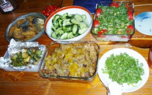 ビールで乾杯の後は「かえる庵」お馴染みの風の森・僧坊の酒・花衣。おつまみは盛隆さんがじっくり煮込んだスペアリブ・みほ子さんの煮豚サラダとキュウリの塩麹漬け・夫美子さんから鯖の和風南蛮漬け・真理子さんのズッキーニの炒め煮などなど、デザートはともこさんからワラビ餅・佐藤錦などなど賑やかに話し込んで散会。