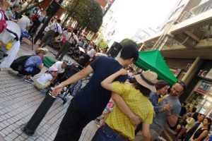 近年は外国のお客様も多く見かけます。パフォーマンスの途中からその周りでダンスを始める人たちも。(写真掲載)