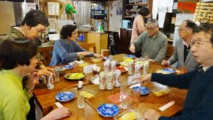 4月1日、会場の蕎麦処「かえる庵」に集まったのは柴橋菜摘・香衣古・林ともこ・佐藤かえる・田中薫・山中あきひこ・池田みほ子・板垣孝志の9名(敬称略)。