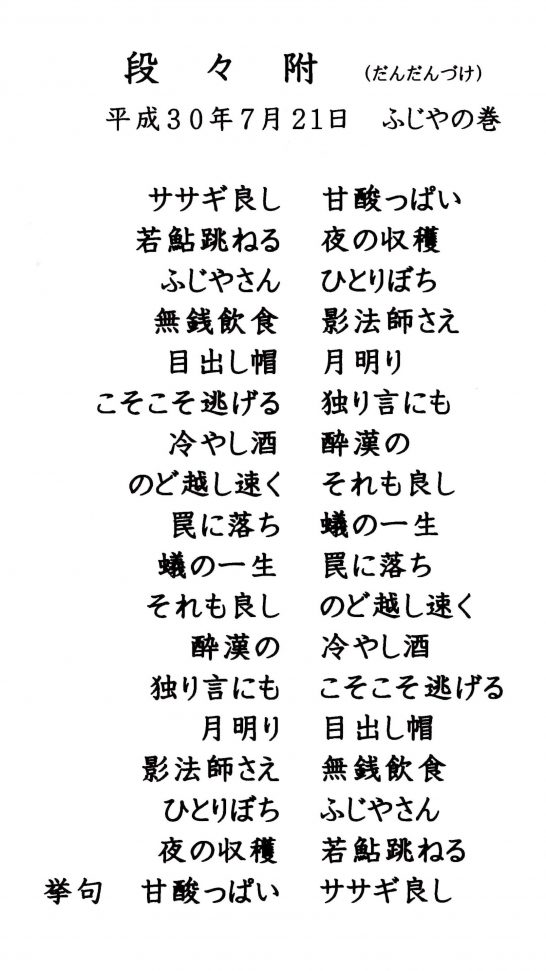 席上、雫石先生のご提案で『段々附(だんだんづけ)』という座興としての川柳の楽しみ方をご教授いただきました。上五、中七、下五を別々の人が次々と連続して付けていき、何巡も繰り返すというもので、ルールは唯一つ。読み手は、直前の行のみを斟酌して作句するというものです。時間の関係で二巡しかできませんでしたが、これを披講してみれば、仕上がりはことのほか上々の出来で驚きました。更に驚きましたのは、逆から読んでも遜色がない。いやいや、逆から読んだ方が味わい深かったのです。これには、驚きました。当日の成果は次の通りです。