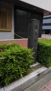 日本銀行仙台支店の前に「国分町」と刻まれた石柱が立っています。