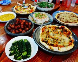 例によって差し入れが凄い!盛隆さんが持ち込んでくれたのは巨大ピザ4種類の4枚\(^o^)/みほ子さんのジャガイモ洋風煮っ転がし、手作り冷奴に新漬け・古漬け!!