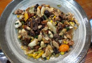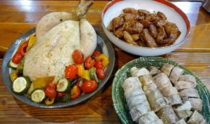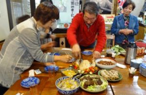 そこに夫美子さんやみほ子さんの自家野菜の手料理が並ぶ、そこに今回は盛隆さんが度肝を抜く料理を持ち出してくれた。丸鶏香草蒸しと肉巻き、スープ、そしてワインは赤玉ポートワインに近い甘みを持つ最高の出来。ここまで来ればもうシェフって感じ。さらにお料理は次から次へ、早々と忘年会の雰囲気