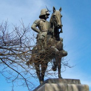 仙台城跡にたつ伊達政宗像、今地震で馬の踝にヒビ・・。