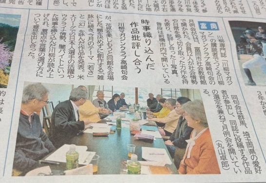 4月12日に標記句会を富岡市社会教育館で行った。参加者は、横澤七五。竹中たかを、田口もとい、内田浩三、今野涼人、須藤良夫、田島悦子、石原惠美子、簗瀬みちよ、湯本良江、滝沢博美、勢藤潤の12名。欠席投句は、大沢覚、星野睦悟朗、天野敏香の3名。新参加者も加わり、句評会は盛り上がり楽しい時間であった。句会には上毛新聞社の記者さんも見えられ、さっそくその様子が今朝の上毛新聞に掲載されていた。