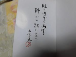 お見掛けをすると、お会いするは別の意味だと思います。初めてお会いしたのは脇屋川柳先生の会でした。その後、写真のご本を郵送して頂きました。本を頂いた時の柳友の対応は三種類くらいあります。①取りあえずの礼状を出し、後程ゆっくり読ませて頂きますというタイプ。(一番、常識的と思います)②こんなに短期間にと驚かされるほどに感想をお寄せするタイプ。(拾い読み型と熟読型あり)③長編で、あるいは難解で、返事を出しそびれてしまうタイプ。
