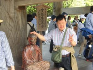 ☝ おびんずる様と息子。背後で僧侶の講釈、何故か川上哲治と長嶋茂雄の話ばかり?Cの帽子を被った少年が、首を傾げて通り過ぎる。