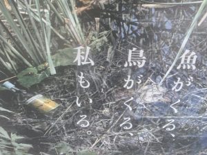 写真はポスターの左下部分です。上半分には大空で鳥たちが飛び遊んでいます。右下には水面に魚たちが群れて泳いでいます。左下には焼酎の空き瓶が転がっています。「自然環境を破壊してはいけませんよ」という啓蒙のポスターかな?しかし、よく見ると瓶は見慣れた文様です。「おや、いいちこではありませんか?」まさか 身内ともいえる愛飲者を叱りつけている訳でもあるまいに。考え落ちのポスターに感心しました。〈♪鐘がボンと鳴りゃさ~、上げ潮南さ~、カラスがパッとでで・・・・」こんなことを連想するのは団扇くらいでありましょう。今晩は、東京鶴彬顕彰会の例会の前に、別の吟行会の下見で牛込柳町の漱石記念館に立ち寄る予定でした。大江戸線の車中で〈月曜日は休館〉と気付いて予定変更。立ち寄った場所は、新宿の日蓮宗の古刹常圓寺です。この報告は後日。どうも後日が溜まり始めました。