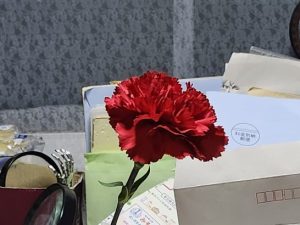 こちらは11日(日)の川マガ東京句会場の成増近辺の花屋さん、妻の用事が遠方で長時間なので、アキヒコを伴っての参加でした。「赤が良い」という息子のリクエストで一輪だけ買い求めました。約170円でした。