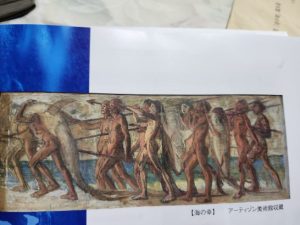 「青木繁は、路銀が無くなって困っていたところを、田村医師から紹介されて小谷家に来た」と伝えられます。小谷家は、地元でも若者等にも理解のあるマグロ船の船主でした。青木は、ひと月半も逗留し、福田たねをモデルにした作品などを残しました。目を凝らしてご覧下さい。裸の漁民が並ぶ真ん中に、まったく不釣り合いな女性の顔が浮かんでいます。たねさんと思われます。