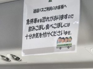 伊東から宿舎までの送迎バス内のポスターです。団扇が気付いたのは帰途でした。〈転倒されないように、十分にご注意ください〉ではないのです。余程の事件があったのでしょうね。どちらにしても、手遅れの掲示です。