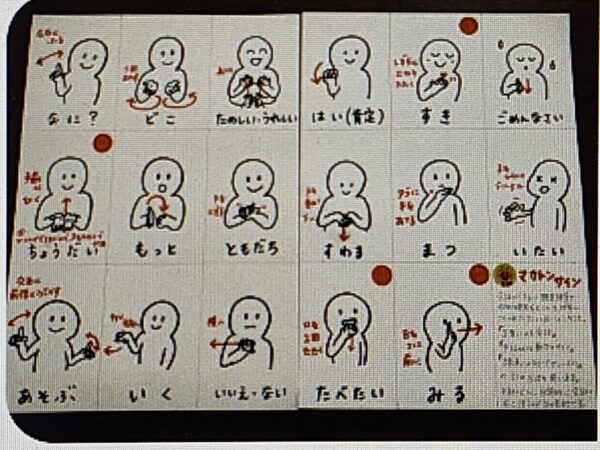 話し言葉・文字や記号・身振り手振り 様々な伝達手段のひとつに マカトン があります アキヒコも上手に利用します 出掛けたくない時の お留守番のポーズ 左の肩の前を 右手の中指で軽く摩る仕草は トイレを意味します 会話にジェスチャーが少ない日本人です 不用意に使用すると 外国人に全く別の意味に解釈される危険もあるそうですが 参考になる伝達方法と 思われます