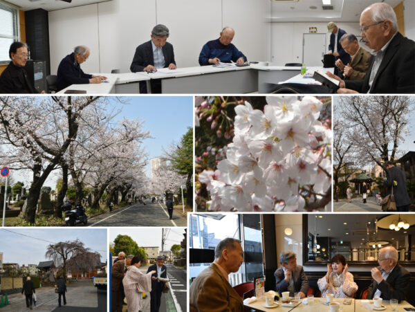 谷中霊園は、まさにサクラが満開。「こんな時に会議だなんて…」と笑いながら、報告と討議が行われました。