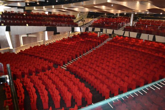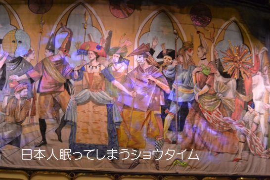 ショウタイムは毎晩あり、通常は2回の公演。歌や踊りがメインだが、マジックなども行われる。写真撮影が許される船も許されない船もあり、多くはフラッシュ不使用での撮影なら許可される。ほとんどは外国船に乗っているので日本人のお客様は数十名ほど。お年寄りの方が多く、お疲れなのかショウの途中でお休みなる方が多くみられる。ショウは英語だから聞き取れない方が多いせいかもしれない。そういう幣も英語はそれほど聞き取れている訳ではないがショウの雰囲気が大好きなのだ。写真はあるクルーズ船の緞帳。これから少しだけショウの中身を紹介します、動画でないのが残念ですが…。どの船もシアターのすぐ傍にカジノがあるのは何か魂胆があるのだろうか。