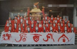 幣の古里ではそろそろ春祭り、神輿(か~はん=神様)、獅子舞、屋台などが町を練り歩く。写真は実家の前の小矢部川沿いの桜並木を行く神輿!神輿は年男が担ぐ習わし、外に出ている連中も神輿を担ぎに帰郷する。年代で法被の色が違う。還暦は赤色。左の写真は幣の還暦仲間たち!赤色は担が