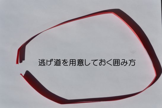 全員互選の課題は「囲む」。何事においても言えることだが、いくら憎い相手でもがんじがらめに追い込んではいけない。そっと相手の言いたいことも聞いてあげることが肝要。もっともスポーツの世界ではそんな甘い考えは通用しないどろうけど…。