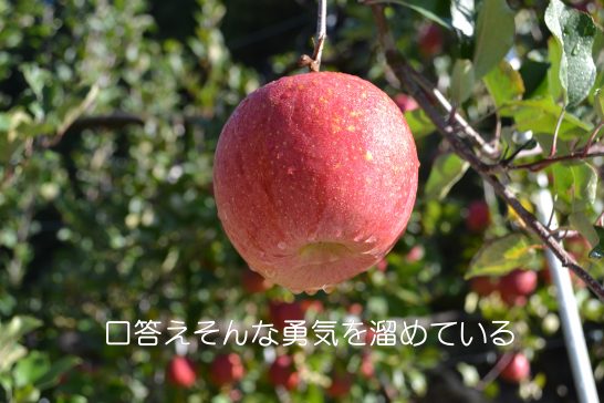 実りの秋、ここ群馬県でも果樹園が賑わっている。数年前孫と行ったリンゴ園、食べ放題と言うがそんなに食べれるものではない、年寄りは1個も食べれば十分…。昔「りんごの唄」というのもあったが、りんごの気持ちになって写真を見ていると何か言いたそうだ!「りんごの気持ち」はよく分からないが、このりんごも何か言いたいことがあるのだろう。幣も小さい頃から誰にも口答えなどせず、ずっと我慢して生きてきたような気がする。もっと好き勝手なことを言える性格であったなら、人生も少しは変わっていたことだろう。でもまあいいかっ、のんびり生きよう…。
