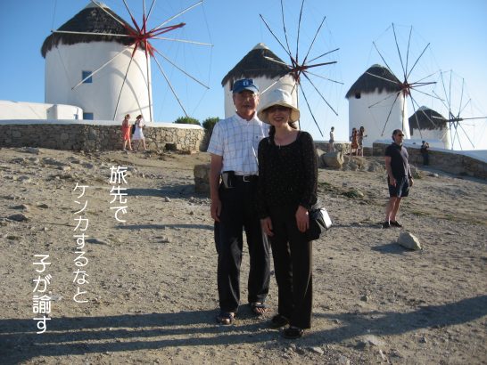 何度も家内と旅をしているが、旅先でのツーショットの写真はほとんどない。ツアー仲間には夫婦で記念写真を撮られる方が多いが、我が家はガイドさんが「撮りましょうか!」と仰っても撮らないことが多い。仲が悪い訳ではないが、別段撮りたいとも思わない。例外的にあったのが十数年前のエーゲ海・ミコノス島での一枚。もう回らない風車が観光名所になっている。この時だったろうか、成田で旅立つ前に子供たちに「留守中よろしく」とメールしたら、長男から「旅先でケンカをしないように!」との返信が来た。子供の前で夫婦喧嘩をしたような記憶はないが、子供心に心配していたのであろう。もっとツーショットを撮って子供たちを安心させる必要がありそうだ。